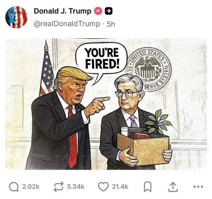 报道称,这张图片疑似由AI生成或数字绘制。图中,特朗普手指鲍威尔大喊"你被解雇了!",而鲍威尔则抱着装有个人物品的纸箱站立,两人身后可见美联储的徽章图案。