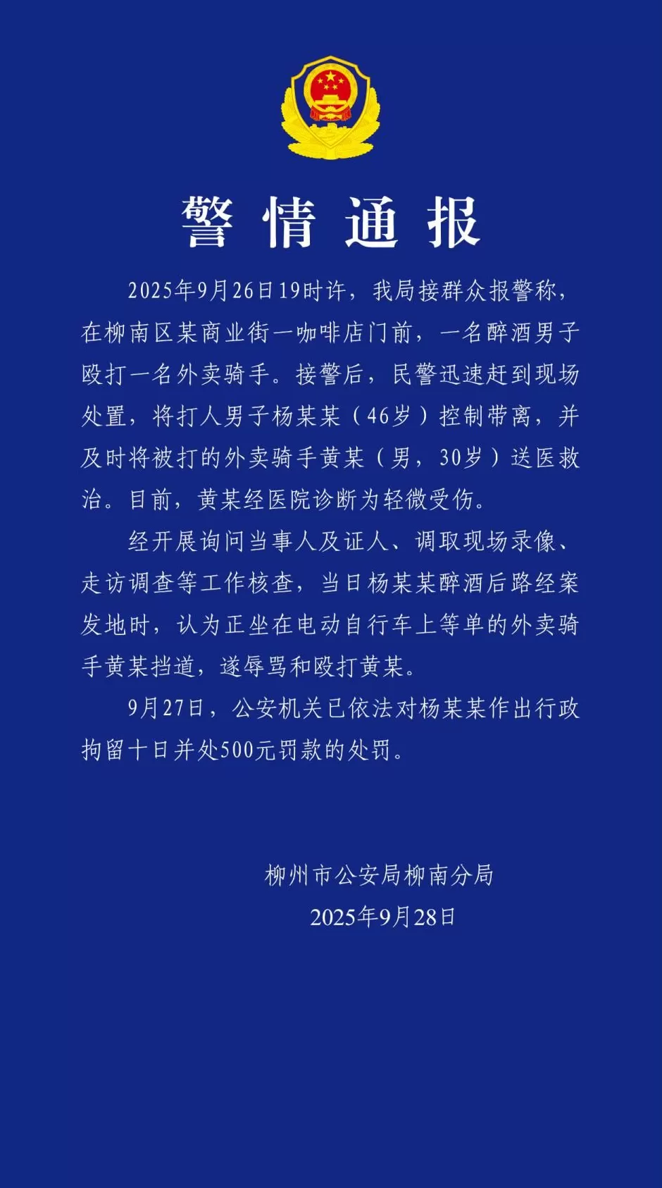 2025年9月26日晚7点左右,柳南警方接到群众报警,称在柳南区某商业街咖啡店门前,一名醉酒男子对一名外卖骑手实施暴力攻击。警方迅速赶赴现场处置,将涉事男子杨某某(46岁)控制并带离,同时将受伤骑手黄某(男,30岁)紧急送医救治。经医院诊断,黄某仅受轻微伤。