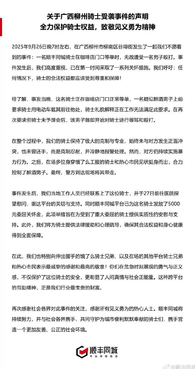 此前,9月27日,"顺丰同城"官方微博发布《关于广西柳州骑士受袭事件的声明》。