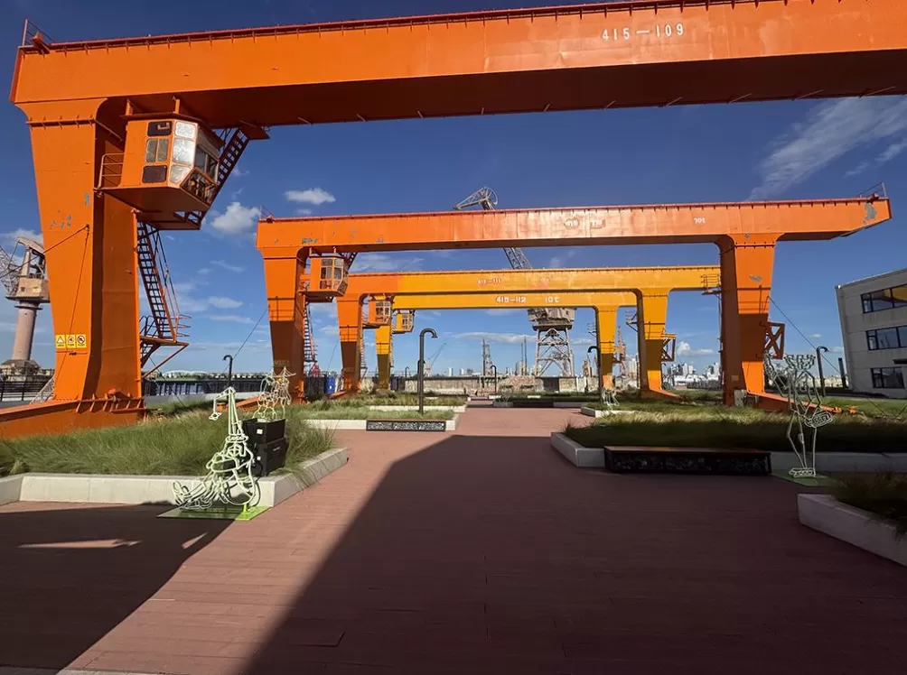 在复兴岛船台公园内,同济大学博士张峰带领团队布置艺术装置,为即将开幕的空间艺术季营造奇幻氛围。