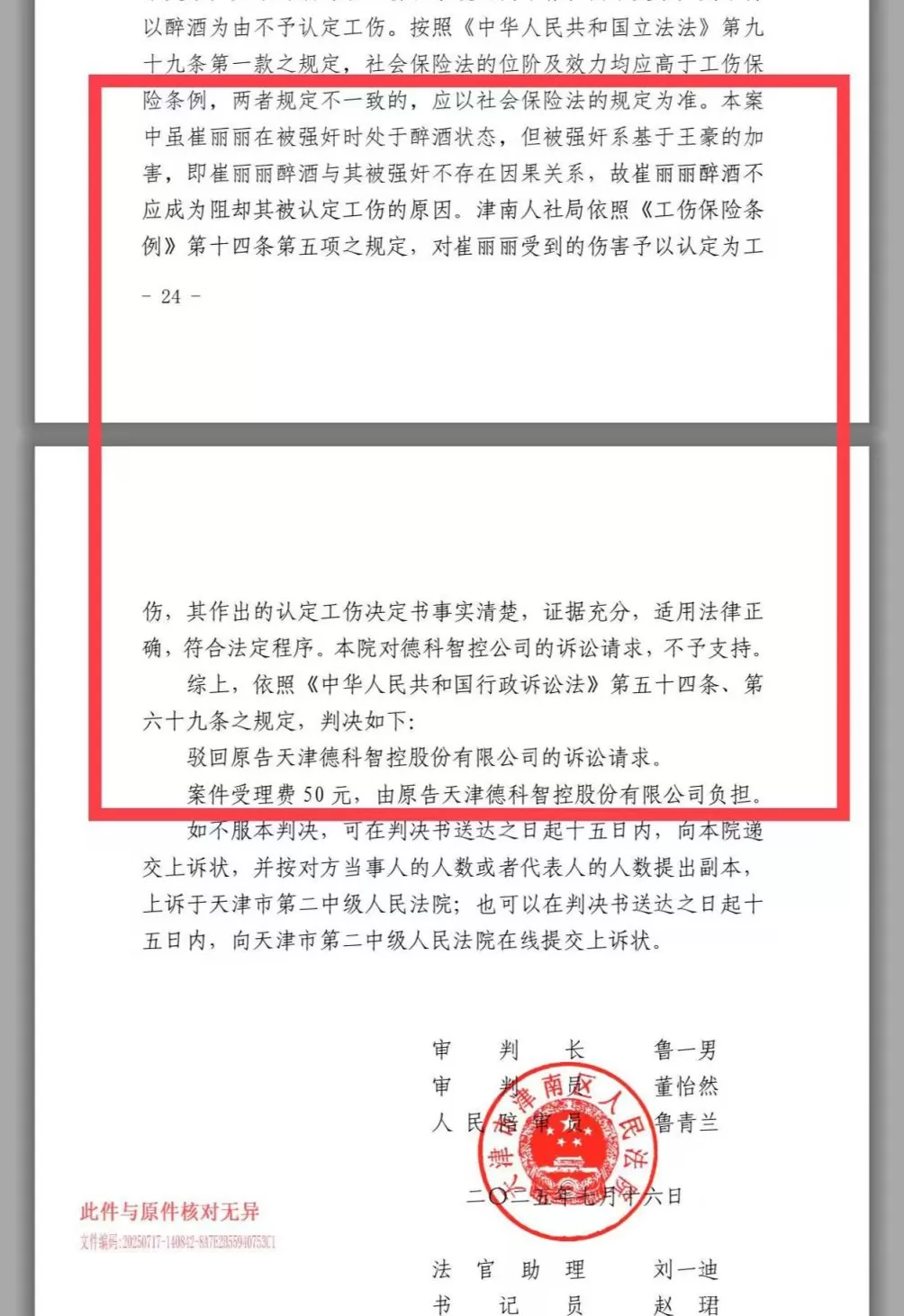 德科智控公司对仲裁结果不满,提**讼。崔丽丽表示,该劳动**案曾因工伤认定案未决而中止审理,待工伤认定案判决生效后,**决定恢复审理。