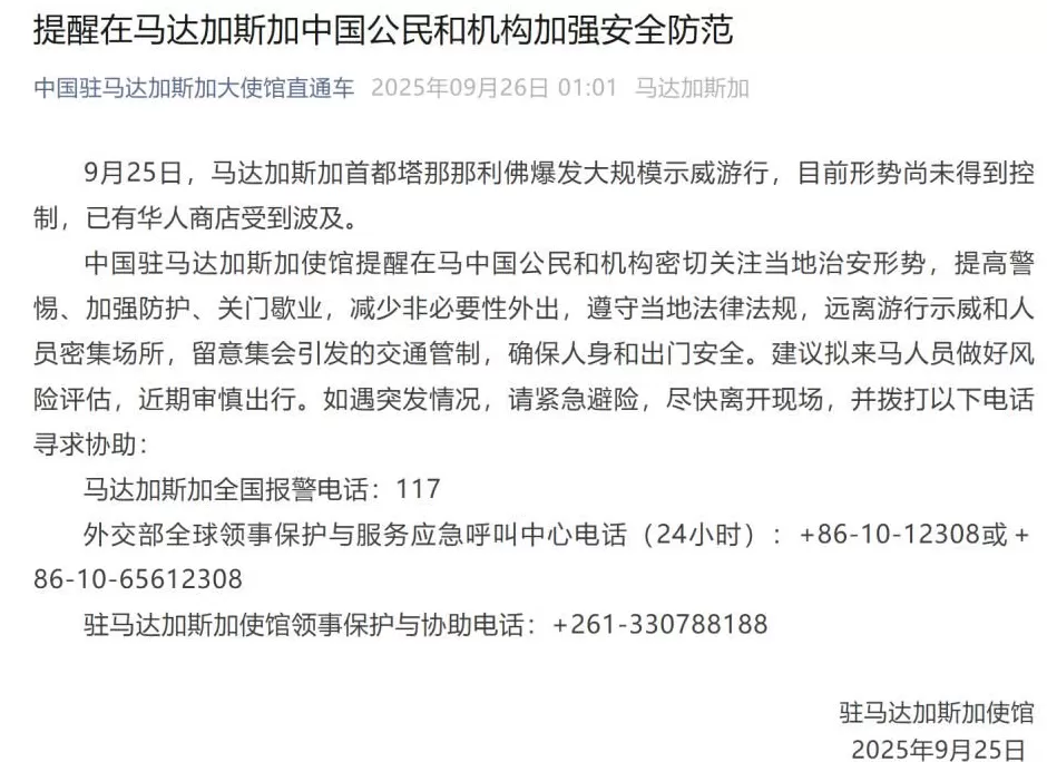 另据"中国驻马达加斯加大使馆直通车"微信公众号9月26日发布的消息,塔那那利佛局势失控后,已有华人商店受到冲击。