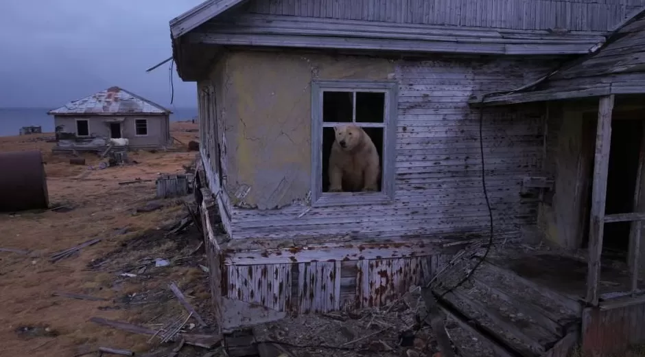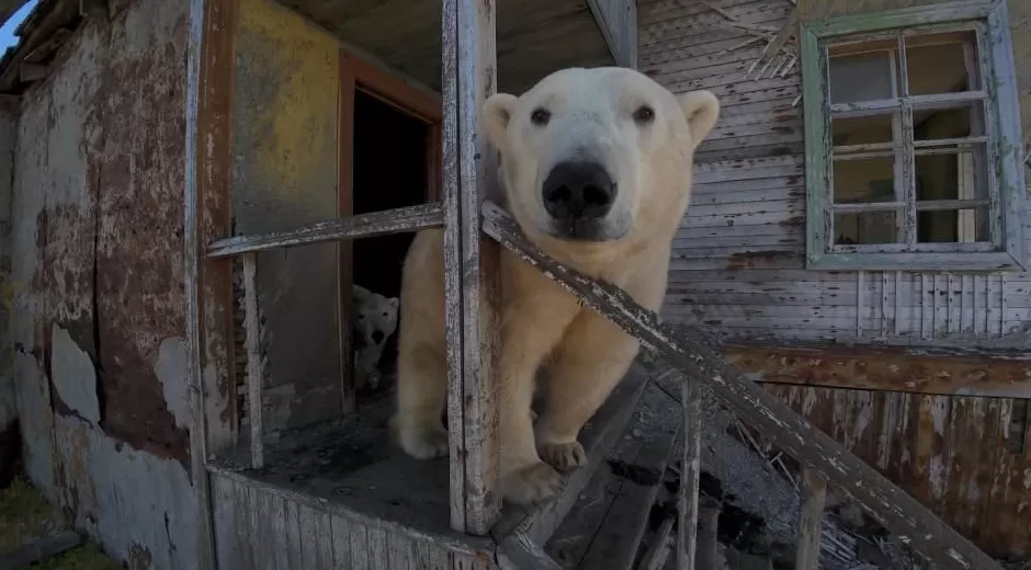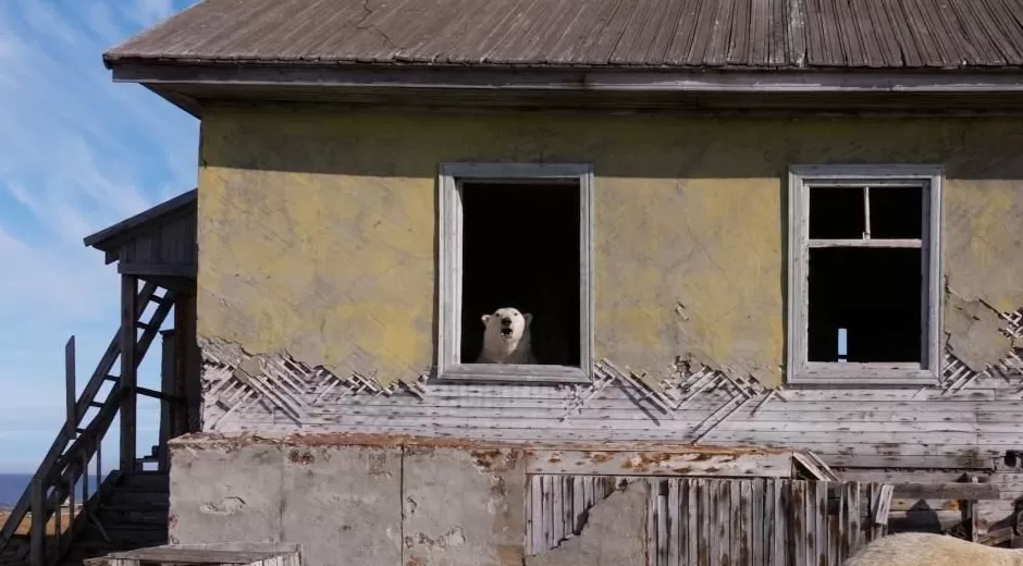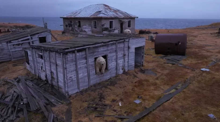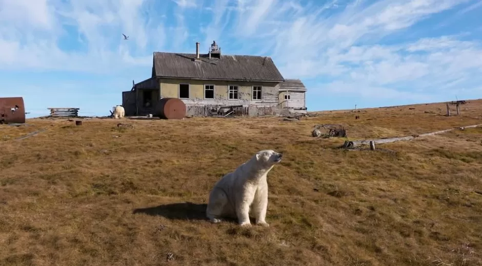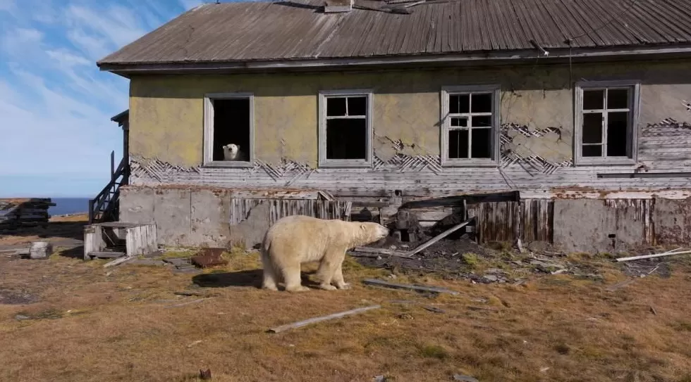 北极熊探索废弃研究站:俄罗斯科柳钦岛无人机镜头揭秘